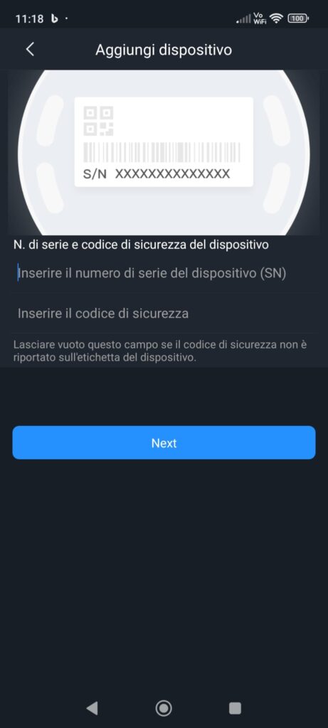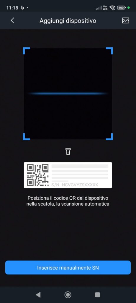 È ora possibile scansionare il S/N della telecamera. Se non lo si ha sotto mano è possibile caricare la foto con l’icona presente in alto a destra.