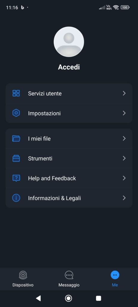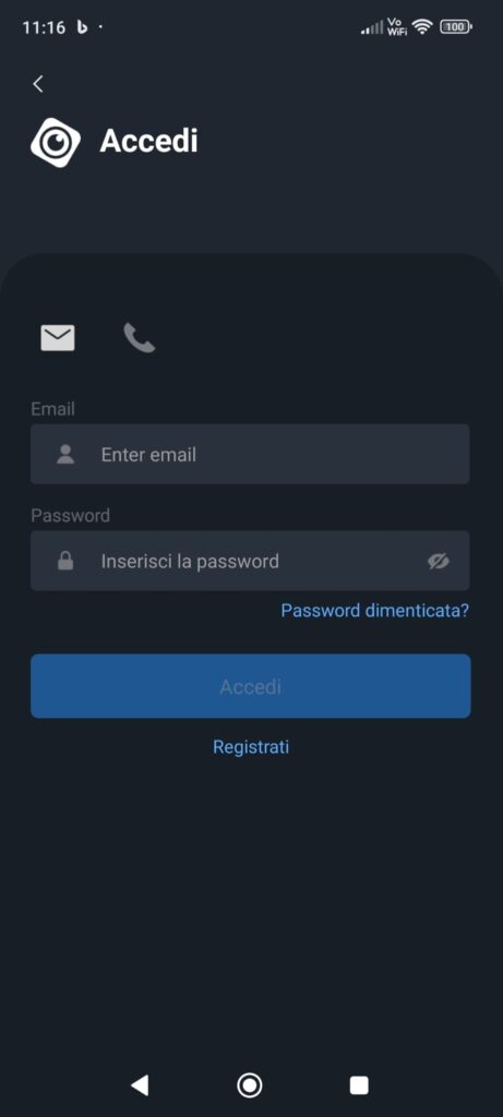inserire email e password col quale si è registrati a DMSS oppure cliccare su Registrati e seguire la procedura di registrazione.